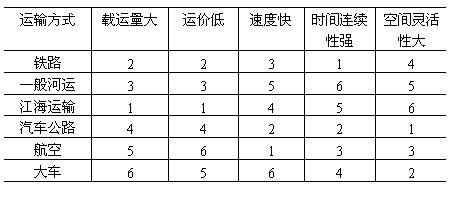 国民经济对交通运输的要求是:载运量大、成本低、投资少、速度快、受季节和环境变化的影响小。不同的运输方式,对上述要求的满足程度是不同的,因而其适用范围各异。兹列表对比,表中数字代表其在某一方面的优劣次序。