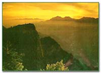 观日出的地点则以祝山为妙。祝山海拔仅次于塔山,为二千四百八十公尺。黑夜退去,天空呈鱼肚白,祝山后先现出一丝红霞,慢慢变成弧形、半圆、大半圆,越来越红,越来越亮。一轮红日先从云海边上升,再从山顶冒出,光芒四射,煞是一番景象。