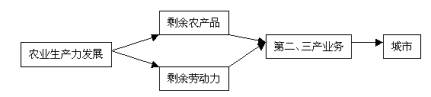 纵观世界各地城市的历史起源,可以得出这样的结论:城市的产生和发展必须具备两个前提条件:一是农业生产力发展,农产品有了剩余;二是农业劳动力剩余。也就是说,当农业生产力创造的农产品,除了第一产业从难从严业者及其实用性所需的份额以外还有剩余时,城市的兴起才有可能;仅有农产品的剩余尚不足以导致城市的产生,还必须要有剩余的劳动力从农业中分离出来,从事第二、三产业的劳动。因此,早期的城市大多起源于农业发达的地区,如两河流域、尼罗河下游、印度河流域以及黄河流域等。这一过程,可用下列简单的框图表示: