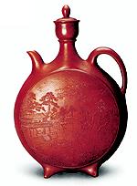 宜兴紫砂壶艺术成就很高,名家辈出,成就最高的要数明代时大彬及弟子李仲芳、徐有良等,清代则以陈鸣远为代表。壶底或壶把下方等处落下作者名款,明为阴刻,清为铃印。北京故宫博物院藏有一件万蝠纹紫砂执壶(见图)造型秀雅,为清乾隆时期典型茶具。器呈瓜楞形,口沿、圆腹、圈足,隆起的盖面及圆形钮,皆模制瓜楞形,腹两侧有弯形流与曲形柄。通体施蓝彩为地,用红彩、金彩绘云头、红蝠、万字带纹,构成“万代安福”吉祥图案,这为传世珍宝。