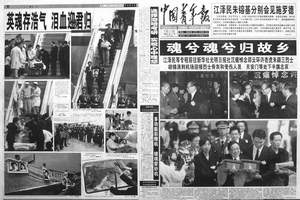 《中国青年报》一版刊登刘占坤的通栏大照片朱福来抱着女儿、女婿骨灰痛苦地走下飞机的镜头