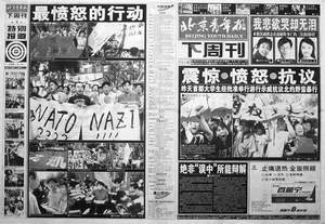 我驻南使馆被炸、三名记者遇难的消息当天经网络、电台、晚报、电视台报道后,全国人民悲愤交加,北京、广州、上海等地的大学生立即自动组织起来,到美国使馆、领事馆游行抗议。自5月9日起,全国报纸以空前的速度和篇幅,大量、详尽地报道了这一严重事件以及全国、全世界的反映,特别是刊登的大量的现场新闻照片,强烈地震撼着人们的心灵。