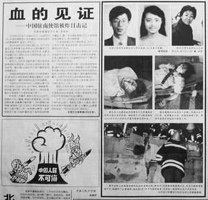 5月9日《人民日报》用了将近3个整版报道这一骇人听闻的严重事件,除文字外,刊登10张照片,把我三名遇难记者的头像、牺牲时的惨状、被炸毁的馆舍、以及中国人民的强烈抗议,统统展示出来。三版上的独家新闻《血的见证--中国驻南使馆被炸目击记》和三位烈士的照片,以及他们遇难时的样子,我今生今世都不会忘记。读这些报道,看这些照片时,我的心都碎了,我是一边哭着一边读完的。