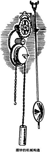 在时钟的机械构造中,除了以上所说的外,好像就没有其他的重要零件了。当砝码落到地面时,时钟的针就会像自行车的轮弧那样,不断地回转!并且发出嘀嗒嘀嗒的声音……如果我们拉住这条铁链子,砝码就别降到相当于铁链子的长度而结束它的运动。
