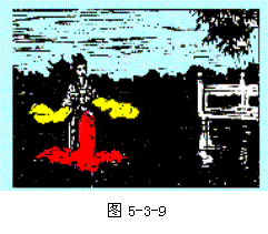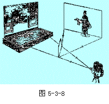 图5-3-9表示了拍摄原理.拍摄前,在摄影棚中搭一个规定的布景,再在地上挖一个水池表示碧波潭.在摄影机的右前方挖一个深坑,演员可以坐升降机从坑中升起.利用四十五度放置的镀铬玻璃,就可以把演员和水池合拍在一张底片上,看上去就象演员从水下升起一样.
