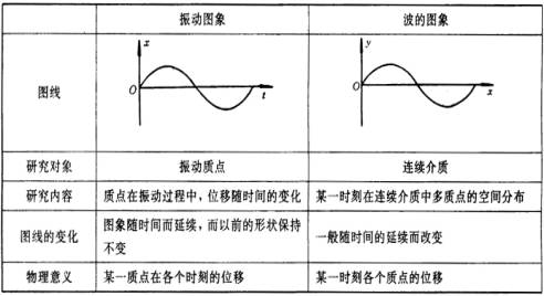 波的图像和振动图像形式相同,都是正弦或余弦曲线。但振动图像表示一个质点在各个不同时刻的位移变化规律,图像随着时间的延长而延伸,原来部分的曲线形状和位置不会改变。波的图像是表示某一时刻沿波的传播方向上介质中各个质点离开平衡位置的位移,在波的传播过程中,波的图像是沿波的传播方向而平移,即形状和位置随时间而变化,只有相隔一个周期时图像才重复相同。