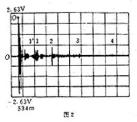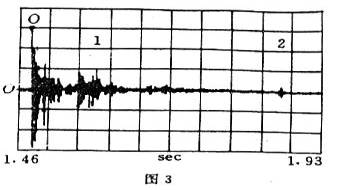 俞文光教授他们不但对三音石的成因做了科学的测试和令人信服的科学解释,还科学地解释了“一音石”和“二音石”两个新声学现象,所谓“二音石”是“三音石”北面的那块石板,在其上击掌会有两声回音,仪器记录如图3,图中标号为1的回波是二音石的第一个回声,是击掌后100毫秒听到的回声,根据计算声波所走路程约34米,这个回声显然是由东西配殿壁墙面反射回来产生的;图中标号为2的回波是二音石的第二个回声,是击掌后380毫秒所听到的回声,其路程约为130米,它约为回音壁圆墙半径32.5米的4倍,据科学工作者分析,声音走的是O2CDO2的三角形,即从O2点出发经C处墙面反射到对面的墙面D处反射回到O2处,恰好走了约等于4倍半径路程,这就是二音石的回声机理。