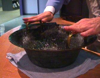 “洗”可以作为实验用具,演示共振现象.实验时,把“洗”中放满水,将双手洗干净,然后用双手去摩擦“洗耳”的顶部.随着双手同步地来回擦动,“洗”会发出蜂呜声,当声音大到一定程度时,就会有水花四溅.继续用手摩擦“洗耳”,就会使水花喷溅得很高.如果用的是“鱼洗”,则水花像是从鱼口里喷出来的一样,十分有趣.