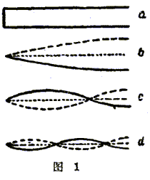 气柱的振动情况与杆相似,这时闭口的一端为波节,开口的一端为波腹(图1).如在管中放上软木粉末,则粉末将在波节处集成小堆,因而可以显示出驻波的存在,这种管子称为孔脱管(图2).图中S为挟架,作为固定棒的中点用,以湿布沿棒长方向擦棒,使在棒中产生驻波,则通过圆纸板的作用就可引起管中气体的振动,移动活塞以改变管长就可在管内得到稳定的驻波.用同一棒在各种气体中作试验可以测定声波在各种气体中的速度,用不同原材科的棒,就能测出声波在各种不同的固体中的速度.用孔脱管还能测出高达40,000赫兹的超声频率.一切管乐器,如管风琴、单簧管、双簧管、笛子等都是使管中产生驻波发出乐音的.
