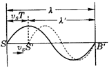 如声源向着观察者运动,这时vS>0.假定vS<v,因为声速仅决定于介质的性质,与声源的运动与否无关.所以在一个周期T内声源在S点发出的振动向前传播的距离等于波长λ.如声源不动,则波形如图3中实线所示;但若声源运动,则在一个周期的时间内声源在波的传播方向上通过一段路程vST而达到S′点,结果整个波形如图3中点S′、B′间的虚线所示.由于声源做匀速运动,所以,波形无畸弯.只是波长变小,其值为λ′=
