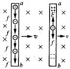 (1)导体切割磁感线运动产生感应电动势,如下图所示,长为L的金属导体棒ab以速度v垂直匀强磁场B作匀速直线运动.棒内的自由电子随棒在磁场中运动,根据左手定则可知,自由电子将受到洛伦兹力沿ab方向定向移动,(自由电子开始定向移动后,洛伦兹力与合速度方向垂直,其中沿ab方向的分力仍使自由电子沿棒定向移动,另一个分力与棒速度方向相反,外力克服洛伦兹力消耗别的形式的能转化为棒内感应电场能),这样,在棒的b端将积累负电荷,棒的a端失去电子带正电荷.由于电荷的不断积累,棒内将出现方向从