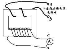 在铁心中产生的磁通绝大部分互相抵消,因而副线圈中感生电动势很小.注意:不可使副线圈的电路断开,否则副线圈将感生很大的电动势(可达1000伏),会危及人员的安全、击穿绝缘,铁心也会变热将线圈烧毁.所以当要拆下安培表时,必须先切断原线圈中的电流,或者先用一根导线将副线圈引出端c、d短路.