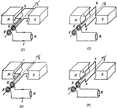 的规律是变化的,关于它的电流方向的变化如图所示,图(1)中,F环为正极,E环为负极,电流的方向沿电阻向上,图(2)中,线圈的ab、cd均不切割磁力线,瞬间电流为零.图(3)中E环为正极,F环为负极,电流沿电阻向下.