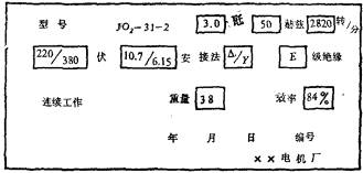 :J(交流异步)O(封闭式)2表示第二次改型设计;3(机座号),1表示1号定子的铁心长;2表示旋转磁场的磁极数,称为2极电机.二极电机的同步转速为3000转/分.额定电压、额定电流是指电动机额定运行时定子绕组中线电压额定值及线电流额定值,其额定值与定子绕组的联接方式有关,铭牌中的220/380伏,10.7/6.16安;
