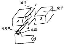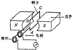 直流发电机和旋转电枢式交流发电机的主体构造是相同的,都是由转子和定子组成的.它们的不同点是:直流发电机中以换向器(即两个半金属环)代替了交流发电机中的滑环,从而就能输出方向不变化的直流电.