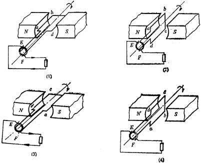关于换向器的作用可参看下图中的示意图,在图(1)中,白半环为正极,黑半环为负极,电流沿电阻向下流过,在图(3)中,黑半环为正极,白半环为负极,电流仍沿电阻向下流过,所以,对外电路而言,电流方向不变.