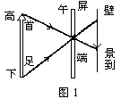 春秋战国时期,墨家学派所著《墨经》的《经下》18条记载了世界上最早的针孔成像实验:“景到(倒),在午有端,与景长,说在端”、此处“景”即影或像,“到”即倒,“午”指遮光屏,“端”即小孔.这句话的意思是,物体的影或像所以倒转,是由于屏上有一点状小孔,入射光线在孔中相交的缘故.《墨经》的《经说》还就倒像的形成机理作了说明:“景:光这人,煦(照)若射,下者之人也高;高者之人也下.足蔽下光,故成景于上;首蔽上光,故成景于下.……”意思是说光照人,人体反射后如同箭一样直进,通过针孔在屏幕上见到的人之下部在高处,人的上部在低处,其原因在于:发自足部的光线被遮去了下面部分,所以成影在上;发自头部的光线被遮去了上面部分,所以成影在下,如图1所示.