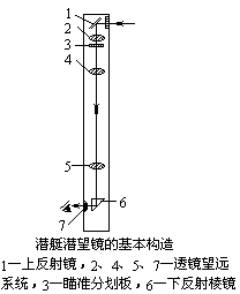 课本介绍的是最简单的潜望镜.实际的潜艇潜望镜的构造要复杂得多,除了上下两个反射镜外,还有对观察目标起放大作用的透镜望远系统,瞄准装置等.图是现代潜艇潜望镜的基本构造图,它的镜筒细长,根据不同要求,镜筒长达7~15米,直径为16~30厘米,镜筒可以旋转,以环视各个方向,上反射镜也可以旋转,能进行仰视和俯视.