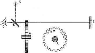 光从光源S发出,经玻璃片K表面反射后,通过静止齿轮A的齿间空隙,经过相当长的距离(约几千米)后,从平面镜Z反射回来,再经齿轮A的齿间空隙,透过玻璃片到达观察者的眼中.现在使齿轮开始转动,并且逐渐加快转速,就会出现从齿隙0穿过的光线,经Z反射回来时,恰好被齿a挡住,从齿隙1穿过的光线,反射回来时又被齿b挡住…….从而使观察者始终看不到Z反射回来的光.当然转速再加快,由齿隙0过去的光反射回来时刚好由齿隙1通过进入人眼,而由齿隙1穿过的光反射回来时又刚好从齿隙2通过进入人眼,人又可以见到Z的反射光了.知道了A的齿数、齿轮的转速以及AZ间的距离,就可算出光速了.例如:AZ间距离为8.6千米,A有720齿,第一次见不到Z的反射光的齿轮转速为12.6转/秒.齿a转到隙0,即转过半个齿间距离所需的时间为