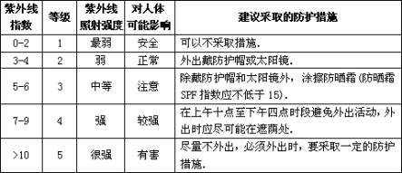 紫外线指数预报是一种在日常生活中十分有用的预报,按照预报发布的紫外线指数,就可以主动地采取一些措施,对紫外线加以预防.当然,紫外线也并不是一个十分恐惧的东西,也不要片面地被紫外线预报所左右.根据发布的紫外线指数,既要采取有效的方法,预防过多地照射紫外线,也要在合适的时间段里有效地利用好紫外线.在一天中紫外线照射强度并不是不变的,一天中最需要十分注意的时间是从上午十时起至下午三时左右.当然,根据天气变化,紫外线照射量也是在变化的,所以也应该注意每天的天气变化,并根据天气的变化,注意在哪个时间段里应该特别小心.