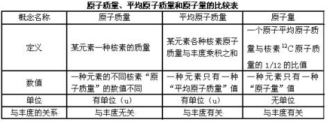 考虑到我们在引入原子量的概念时,不仅用了原子质量的概念,还用了平均原子质量的概念,所以,为了更便于比较这三个概念列表如下: