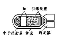 如果铀235的体积超过了它的临界体积,只要中子进入铀块,立即会引起铀核的链式反应,在极短的时间内就会释放出大量的核能,发生猛烈的爆炸.原子弹就是根据这个原理制成的.图中所示弹构造示意图,弹壳里装着分开放置的高浓度铀235,每块的体积小于临界体积,因此不会爆炸,铀块外面包着一层能够反射中子的物质(如铍),叫做中子反射层,以减少跑出铀块的中子,当铀块后面的普通炸药爆炸时,火药燃烧后气体把分开的铀块压到一起,由于空气中有游离的中子,铀核自发裂变也能产生一些中子,这样,超过临界体积的铀块立即发生链式反应产生猛烈爆炸.