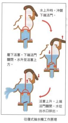 往复式的抽水机速度慢,容量小,液体可以升举得很高,适合抽清洁的液体 ,如旧式的抽水机.