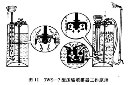 压缩喷雾器是靠预先压缩的气体使药液桶中的液体具有压力的液力喷雾器.按喷雾器的携带方式有肩挂式和手提式两种,农用压缩喷雾器容量6~8升,都为肩挂式.我国生产的农用压缩喷雾器有3WS--7型(也称552丙型)、三圈-6型.3WSS--6型和3WSS--8型等品种.