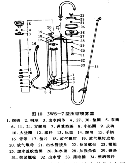 3WS--7型压缩喷雾器的喷洒部件与工衣一16型背负式喷雾器相同.