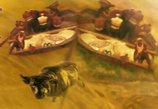 准备工作做好之后,怀丙命人把船上的泥沙扔到河里去,泥沙被一铲一铲地扔河里,大船慢慢地上升,终于把铁牛从淤泥里拔了出来.怀丙又叫人把船划到造浮桥的地方,两艘大船拖着没在水里的铁牛,回到了它们原来的位置.