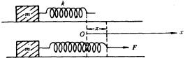 上述的例子只是抬物体的转动情况,事实上,即使对于没有转动的物体,有时也必须从“力的作用点的位移”来计算功,才能得出正确的结果.如图所示,用一质量不计的弹性系数为k的弹簧连接一重物M.若用力F将弹簧拉长x,但重物因受阻力作用本动.在此问题中,若按“物体的位移”来算功,由于物体位移为零,则力F所做功为零,显然是错误的,只有从“力的作用点的位移”来计算功才能得到