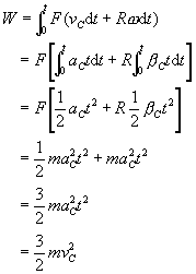 .因为F是恒力,所以圆盘质心作匀加速运动,转动也是匀角加速的.于是,在质心移动s的有限时间t内,力F所做的总功为: