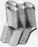 在下页图中,可见巢室排得很紧密,蜜蜂已经用半菱形十二面体将端处盖好。此外,蜜蜂所建室壁的斜度是13°,这样可以防止蜂蜜在端顶被蜡帽封盖前流出。