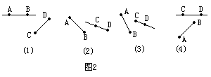 在图2(2),(3)中,AB是线段,而DC,CD都是射线,但是延伸的方向不同,图2(2)中射线DC向左延伸一定和AB相交,而图2(3)中的射线CD向右延伸与线段AB不能相交.