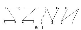 简析:可把图形分解成四个简单的标准化图形.因而得到图2的四个图,共有四对相等的内错角.即∠ABD=∠CDB,∠BAC=∠DCA,∠ADB=∠CBD,∠DAC=∠BCA.