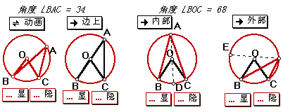 几何教学中,应重视引导学生观察、分析,培养和发展学生的思维能力。 运用多媒体教学手段进行教学,有利于引导学生观察、分析。如圆周角定理的证明(如图8),可(1)先击动画按钮,通过点B的运动,让学生看演示获得初步结论,思考如何叙述。(2)再观察圆周角有几种形式,寻求证明办法。(3)击显示按钮,使陆续出现下面三种类型。演示中使学生认清圆心在圆周角的一边上是一个特殊位置,启发学生得出证明方法,教师把握显示序列按钮, 分步给出证题过程。(4)接着让学生观察 分析,找出当圆心在圆 周角内部或外部情形下结论的得出方法。(5)最后完整地归纳出圆周角定理。整个过程周全、有条不紊,画面美观而不眼花缭乱。