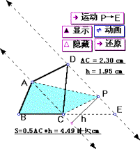 几何画板的动画、运动、测算功能为图形的运动、计算变得简便。如图1,要使四边形ABCD等积变形成一个三角形且保持“AB、BC不动”,可在画板中先过点D画AC的平行线DE,交BC的延长线于点E,在DE上任取点P,连AP、CP。设P到AC的距离为h,则当P在DE上作动画时,SΔPAC总等于SΔDAC。显然,在P运动到E时符合要求。在图形的运动过程中,同学发现了本题有两解。这时可进一步提出下列问题给学生思考:如果将“AB、BC不动” 换成“BC、CD不动”怎么画?换成“一组邻边不动”则本题有几解?能否将一个五边形等积变形成三角形呢?