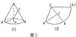 分析:小虫沿圆锥侧面从A点爬到C点,其轨迹是空间的一条曲线,且在一曲面上.问题如何解决呢?依题意我们画出圆锥的侧面展开图,如图3所示.不难看出,母线SB把扇形分成相等的两部分.从A点到C点的线段AC的长度就是所求的最短距离.