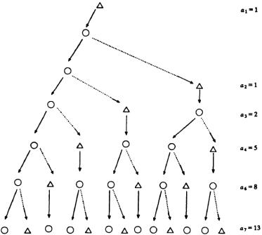 (第3个月一对大兔子生出一对小兔子,总共两对兔子),……我们用下面表示兔子的繁殖规律,图中△表示一对小兔子,○表示一对大兔子,实箭头表示一对小兔子长大成为一对大兔子或表示一对大兔子照样生长,虚箭头表示于对大兔子生出一对小兔子.