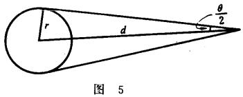 假如观测到月球对地球上一点所张的视角是32'。那么怎样计算出月球的大小呢? 如图5,设r是月球的半径,d是月球离地球的距离,θ是月球对地球上一点所张的视角。 利用直角三角形解法,