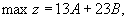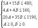 某啤酒厂生产两种啤酒,其中淡色啤酒A桶,啤酒B桶.粮食、啤酒花和麦芽是三种有约束的资源,每天分别可以提供480斤、160两和11 90斤.假设生产一桶淡色啤酒需要粮食5斤、啤酒花4两、麦芽20斤;生产一桶啤酒需要粮食15斤、啤酒花4两、麦芽35斤.售出后每桶淡色啤酒可获利13元,每桶啤酒可获利23元.问A,B等于多少时工厂的利润最大.