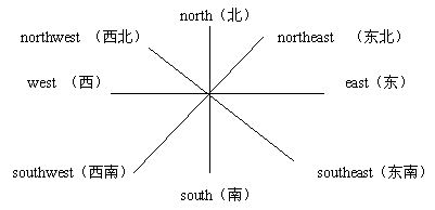 中文的东北、东南、西北、西南与英文的顺序不同。(如下图)
