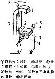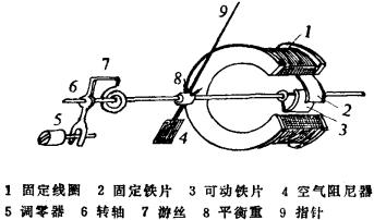 原理:当线圈中通以电流时,通电线圈产生磁场,对铁片施加磁力作用,迫使转轴带动游丝转动.当游丝产生的反抗力矩与磁场对铁片的吸引力矩平衡时,指针指出电流的值.