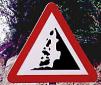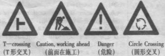 警告车辆(vehicles)、行人(pedestrians)注意危险地点的标志。其形状为等边三角形,颜色为黄底、黑边、黑图案。如: