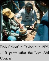 Bob Geldof, pop star in decline, was prompted by television reports of the famine in Ethiopia in October 1984 to turn crusader in the cause of reawakening the pop music world's sexual conscience. He established the Band Aid Charity, which in turn inspired USA for Africa in the U. S., to raise money for famine victims. He then employed his energies in organizing the hugely ambitious and successful Live Aid Concert, which took place in London and Philadelphia on July 13, 1985. In its wake Geldof was nominated for the Nobel Peace Prize.