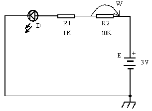 工作原理 把两个电阻一个接一个地顺次连接起来,叫串联电路.连接后,先将一个10K电阻R2用短接线(W)接短路,此时R=R1,通过发光二极管的电流会较大,灯较亮.然后去掉短路线则通过发光二极管的电流会变小,变暗,即说明串联后总电阻增大, R = R1 + R2.
